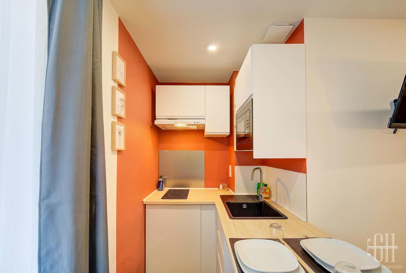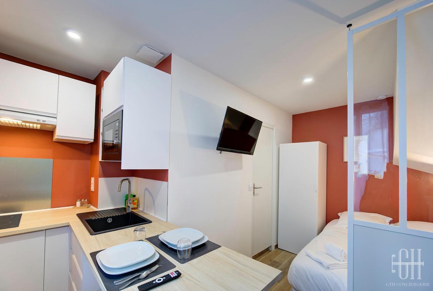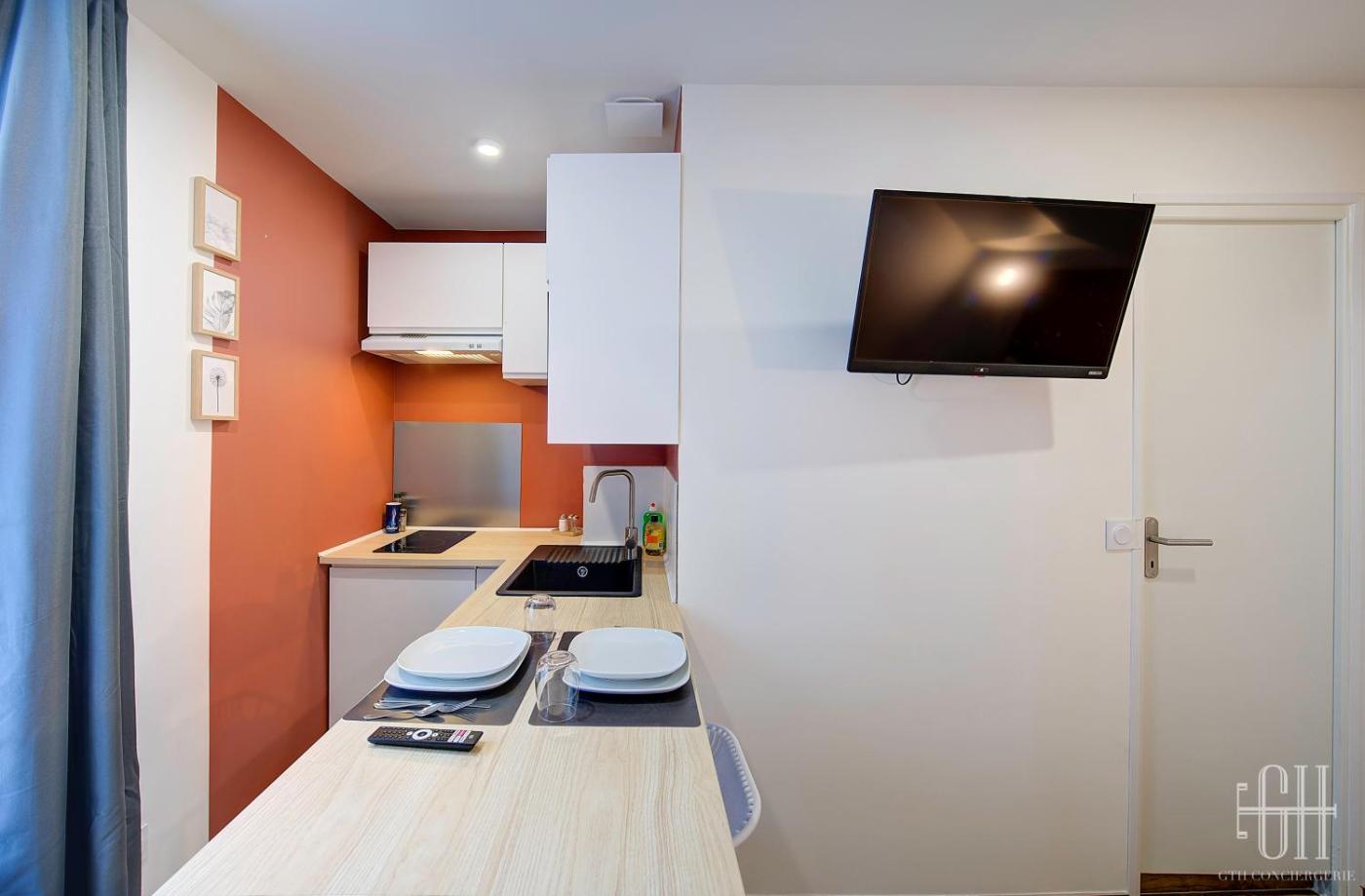 Appartement 1 Chambre. This apartment consists of 1 bedroom, a kitchen and 1 bathroom with a shower and a hairdryer. The fully equipped kitchen features a stovetop, a refrigerator, kitchenware and a microwave. The apartment provides a tea and coffee maker, a dining area, heating and a flat-screen TV with streaming services. The unit offers 1 bed.